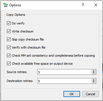 Check MM set consistency and completeness before copying: If enabled, MM set will be validated for consistent raw data folder structure, Also the number of MMs will be checked to match the disk count stored in the disk setup file to make sure that the MM set is complete. If not fulfilled, a warning is given to the user.