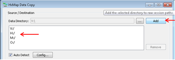 First use the Browse button to pick the data directory. As long as the <Auto Detect> checkbox is set, it is sufficient to browse only to the first MM30. The data copy tool with then use described auto-detect logic to automatically search and detect the remaining MM30 as soon as the <Add> button is pressed.