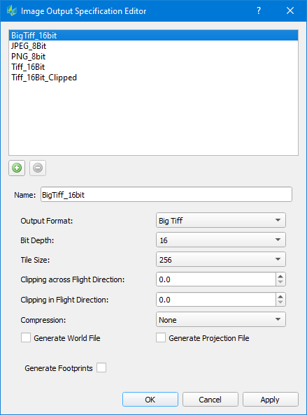 Select any option between 16 and 1024. Specifies the size of each internal Tiff tile size.Clipping across Flight Direction / in Flight Direction