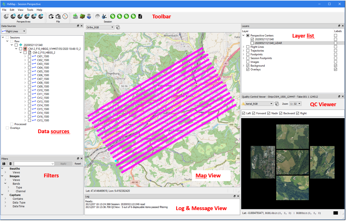 The map view is the central element of each perspective. It allows to display collected data in a spatial context (location, flight layout, etc.).