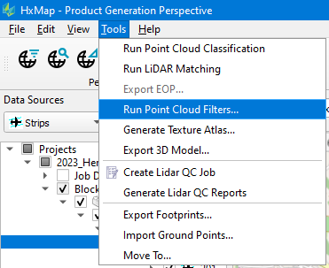 Point cloud filtering can be applied in Product Generation perspective to Lidar takes or Infocloud product generation job results in a project by the Run Point Cloud Filters tool.