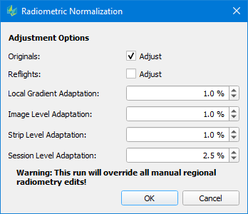 Following this step, user can then launch a radiometric normalization. Clicking the toolbar icon will bring up a dialog window that allows to define the adjustment options to be used for the normalization: