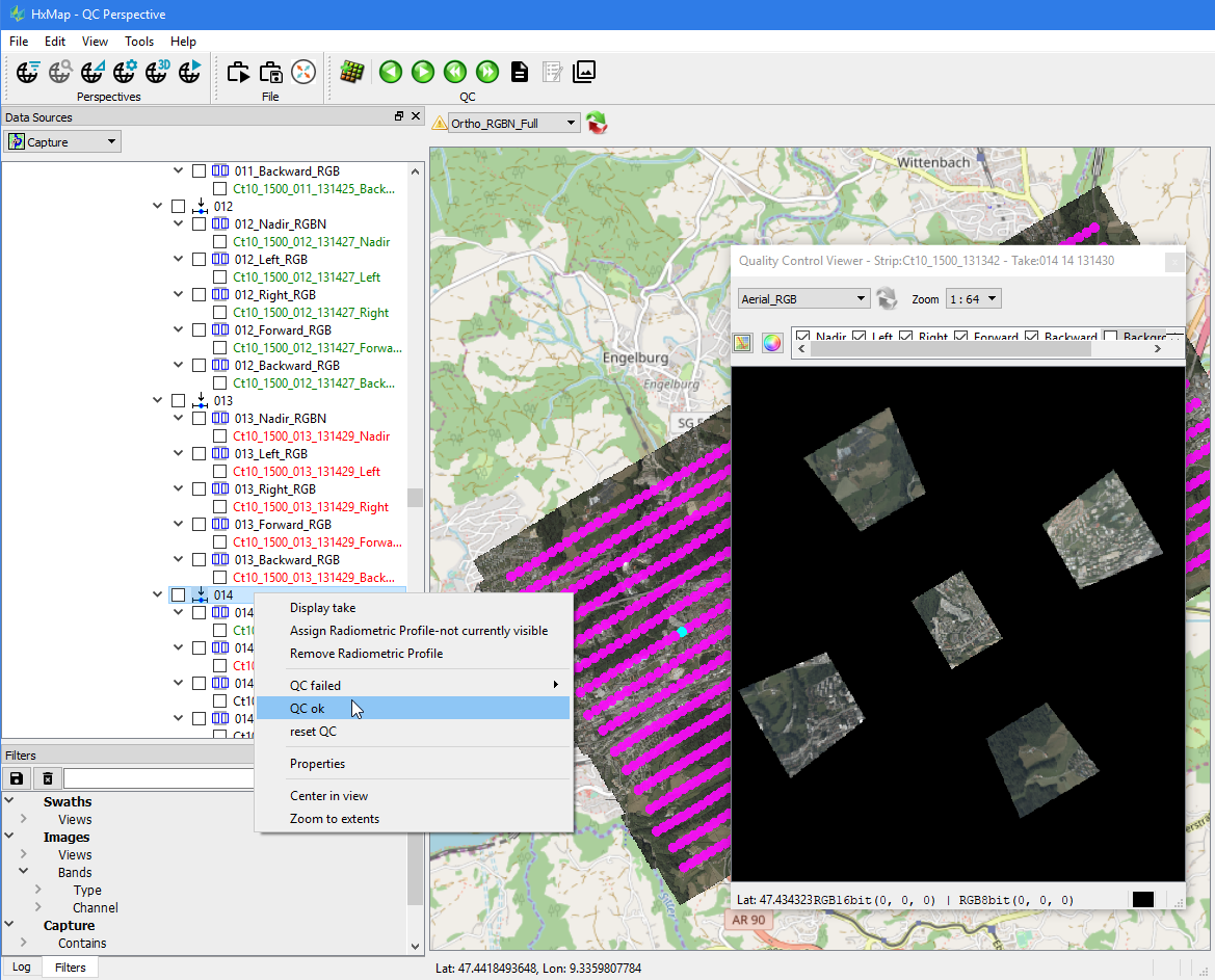 For each individual capture (both images and LiDAR), the QC state can be set and persisted. Unless data has been flagged during previous workflow steps (e.g. during Raw QC), all captures start in default state and are therefore considered as not QCed.