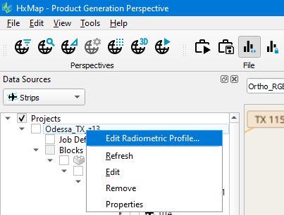 Blockwide Radiometry provides for a single Global Radiometric Profile to be defined for the entire block. The profile is edited through a similar Image Adjustment Tool as is used in QC Perspective. It is launched from the Project context menu in the Data Sources. Disable the Autostretch if it is active on the map window before editing the profile.