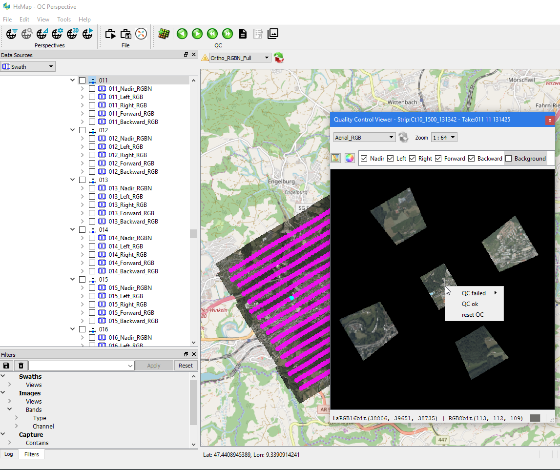 For each individual capture (both images and LiDAR), the QC state can be set and persisted. Unless data has been flagged during previous workflow steps (e.g. during Raw QC), all captures start in default state and are therefore considered as not QCed.