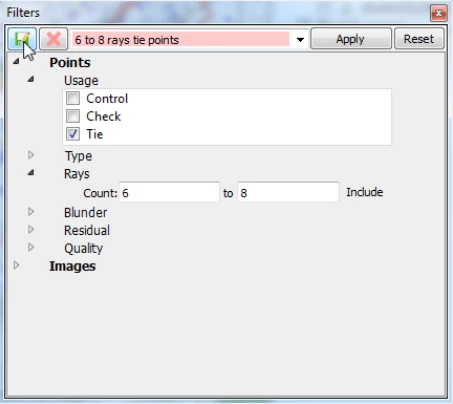If the user, for example, only wants tie points displayed that have been measured in at least 6 but no more than 8 images he needs to enter '6' and '8' in the Rays Count fields in the filter view and hit the 'Apply' button.