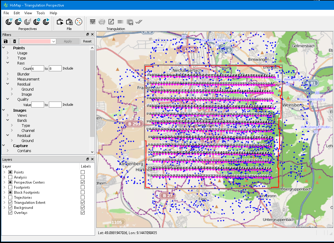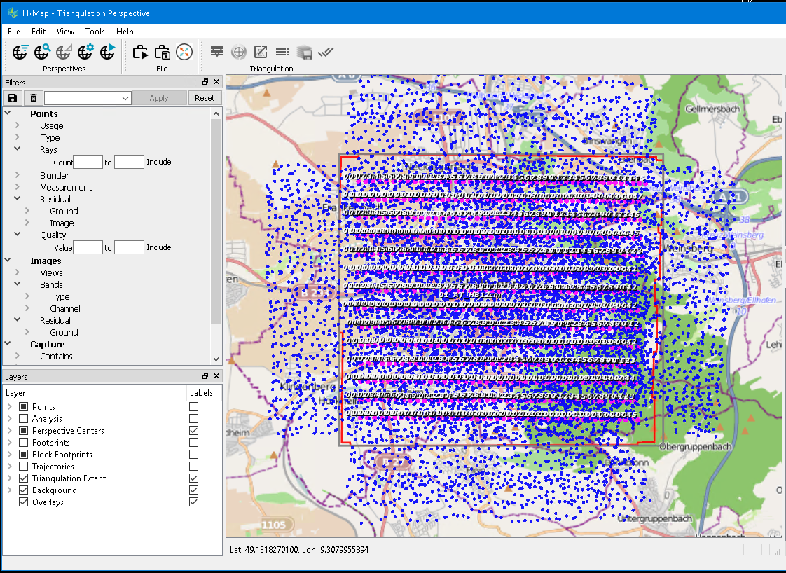 In the above screenshot the user is in the Triangulation Perspective and tries to evaluate the distribution of tie points after running Automatic Point Measurement (APM). Initially, no filters are set, and the Point, Block Footprints, Triangulation Extent and Background layers are turned on.