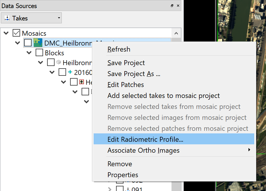 The Mosaic perspective allows to define and add a global radiometric profile to a mosaic project. This radiometric profile will be applied to all loaded imagery data and is used when writing out the mosaic tiles.