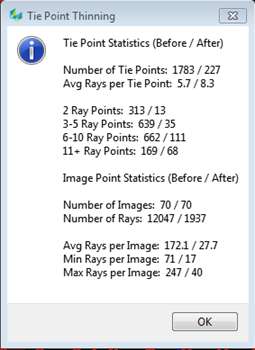 Launch the point thinning via the Tools menu > Thin Tie Points. The process of point thinning is immediately started. After it finishes, an information pops up which informs about point statistics before and after the thinning process: