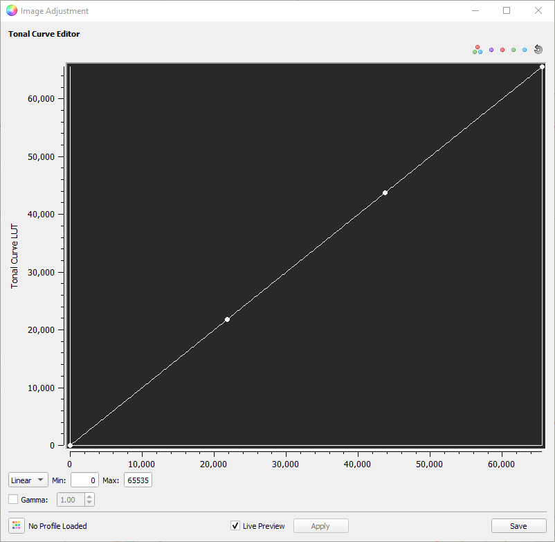 As we now consider a profile assigned to the entire block of images, the Image Adjustment tool will only show the Tonal Curve Editor window. The Min and Max value will default to 65535.