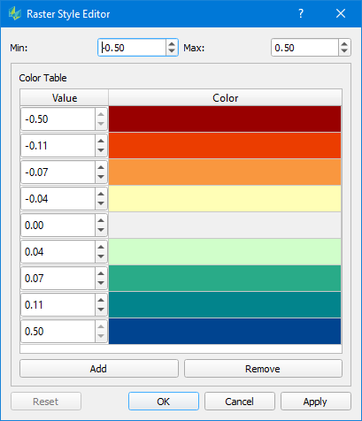 Modify the values by either typing in a new value or using the arrow buttons. Colors can be changed by clicking into the color field. Use the add/remove buttons to adjust the number of values. Adjusting is always done at the end of the list by adding another item before the last item or removing that item.