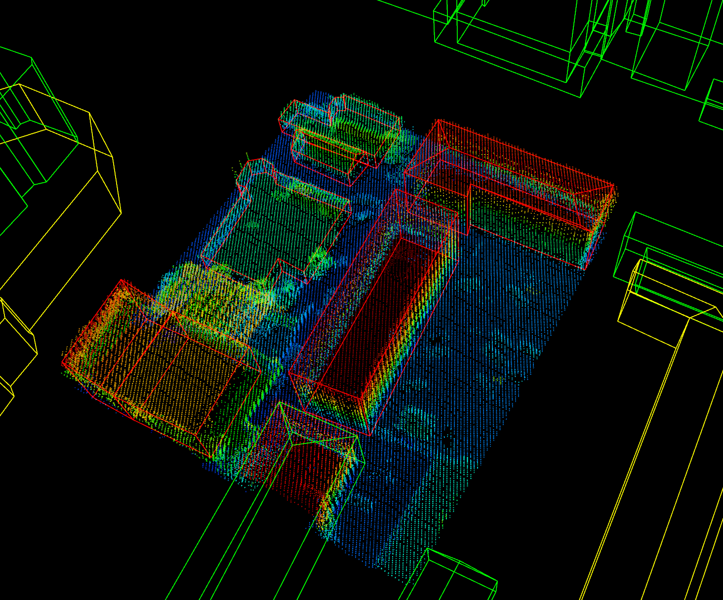 To visualize the point cloud, select the object(s) for which LiDAR points shall be loaded. From the View toolbar, click the "Load point cloud" button. HxMap will then create a bounding box around the selected building and extract all points from LiDAR strips that cover that area.