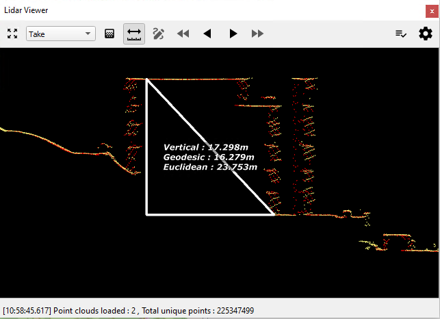 The distance measurement tool within the Lidar viewer allows to measure distances between two selected points. Distances computed are given for:
