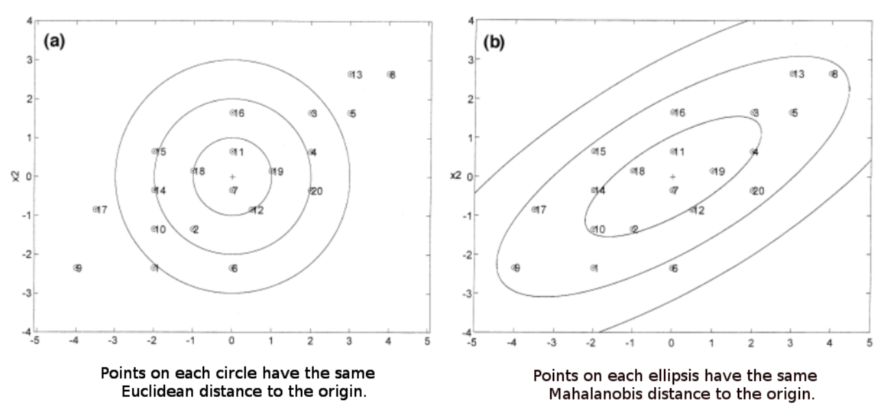Compared to the Euclidean distance, the Mahalanobis distance takes into account the spatial distribution of the neighboring points (see example for 2D space below). In 3D space, Euclideon distance would be equal for all axes in the symmetrical spheres, while for the Mahalanobis distance, this gets adjusted to ellipsoidal spheres depending on the spatial distributions calculated.