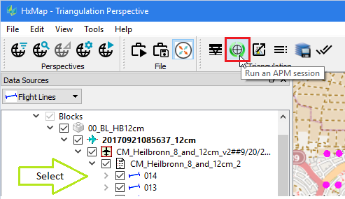 After APM is finished, select the triangulation project via the Data source tree and use the right click context menu. The "Refresh" option will reload the project and display the generated points. The information is read from the block(s) where the tie point information is stored as *.ipb files.