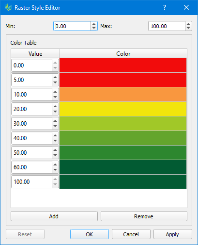 Modify the values by either typing in a new value or using the arrow buttons. Colors can be changed by clicking into the color field. Use the add/remove buttons to adjust the number of values. Adjusting is always done at the end of the list by adding another item before the last item or removing that item.