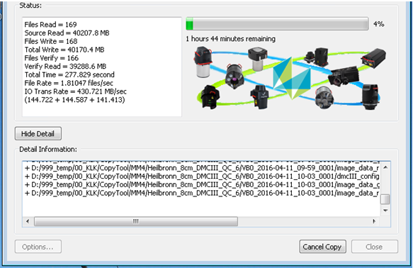 The copy status is displayed via a status window and a progress bar. Detailed listing of the copies items can be found in the lower section, which is shown once the user hits the <Show Detail> (Hide Detail) button.