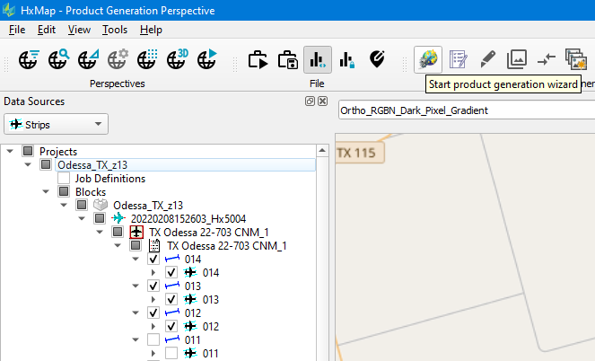 Data products are created by defining and executing a new Product Generation job within a HxMap project. Within your defined project, select the data from the block or job result that you want to use as input for your Product Generation job. Creating a Product Generation job from a block outside of a project is not supported.